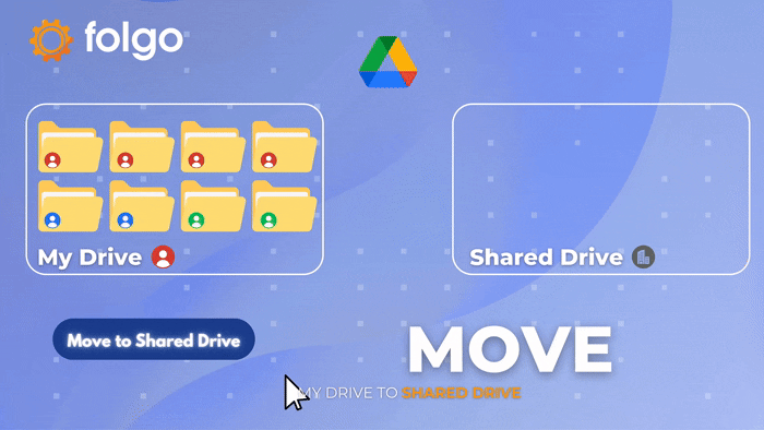 Folgo's Move to Shared Drive functionality makes it possible for any regular user that does not have administrator privileges to transfer entire folders and files from My Drive to Shared Drive (learn more about the Move to Shared Drive prerequisites).